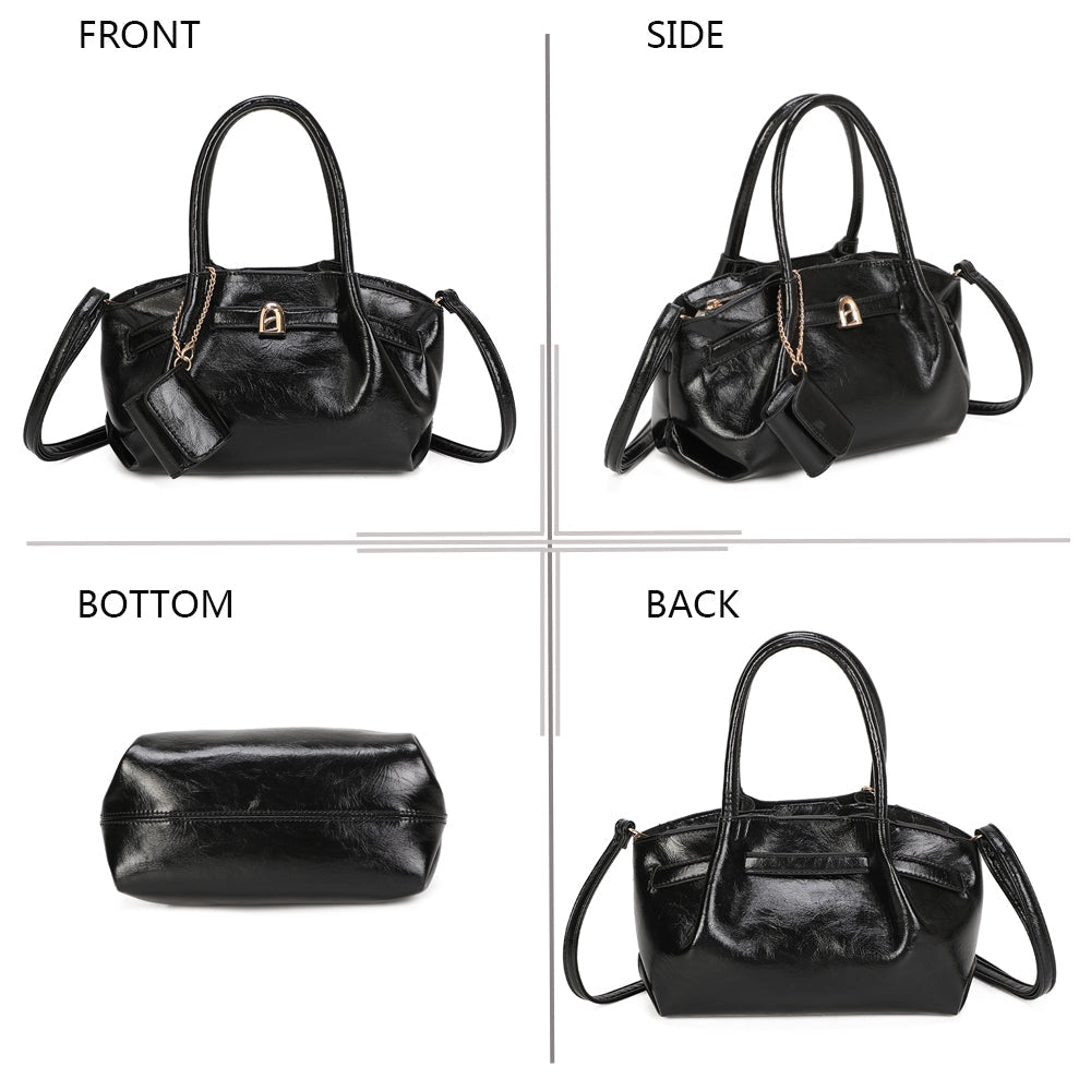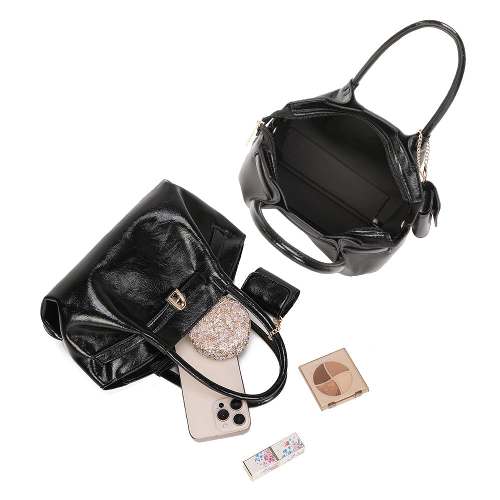 Questa borsa non è solo bella, è intelligente. L'interno ben organizzato offre uno scomparto principale spazioso, una tasca con zip per i tuoi oggetti più preziosi, e tasche dedicate per telefono e accessori. La fodera resistente si pulisce in un attimo. Con 25x17x12 cm, contiene tutto ciò che serve senza compromessi: telefono, portafoglio, trucco, chiavi. La finitura lucida cattura lo sguardo, i dettagli dorati aggiungono carattere, e il piccolo lucchetto decorativo con mini pochette coordinata è il tocco che fa la differenza. Manici arrotondati confortevoli, forma morbida che non si deforma. Versatile per ogni occasione: dal casual all'ufficio, fino alla serata.