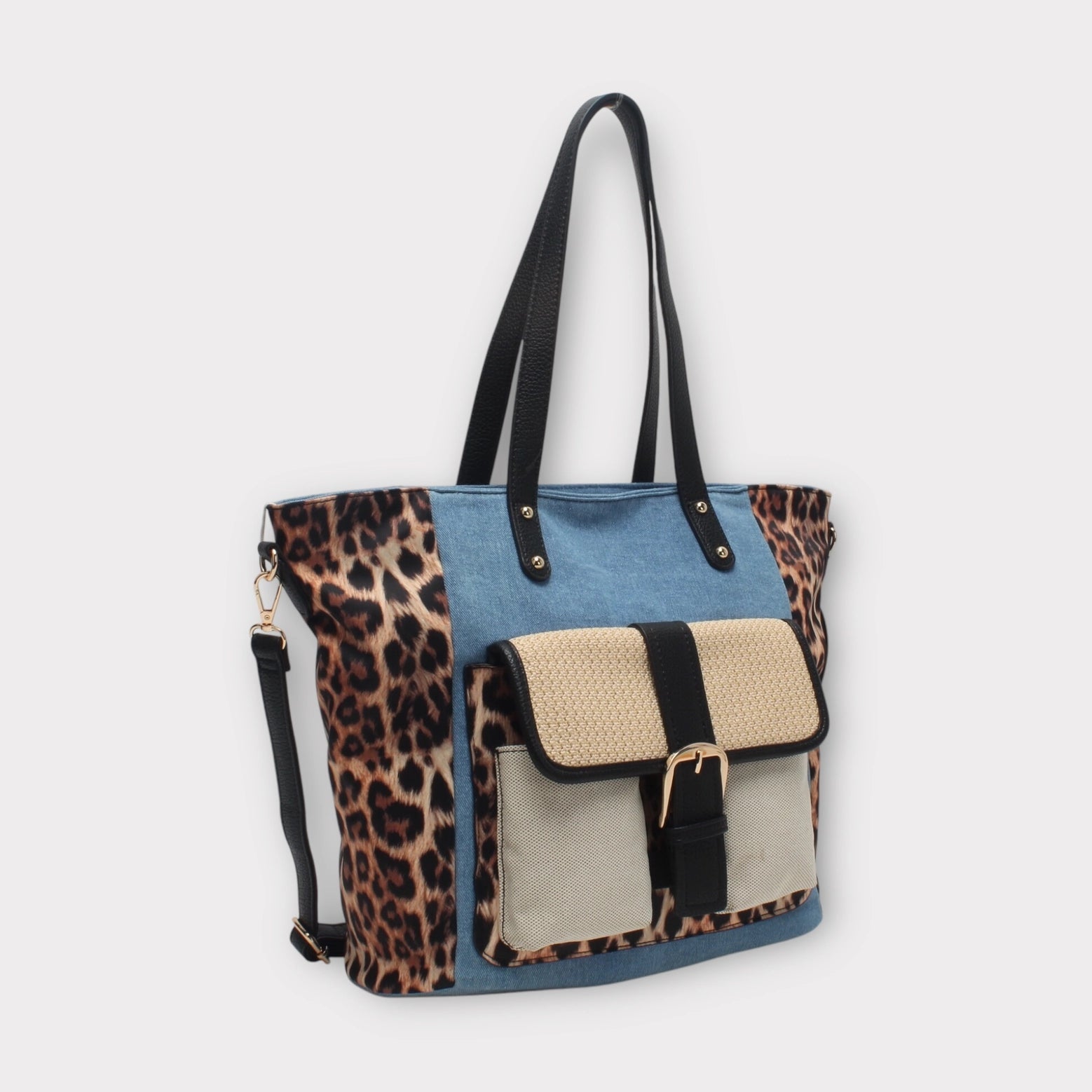 Borsa shopper con manico, tracolla, tasca anteriore, effetto leopardato MODELLO Hunter